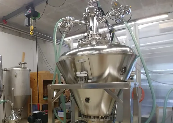 The cleaning of the PTS Batchmixer® is carried out the same way as the mixing process itself. Cleaning liquid is transferred by PTS Powder Transfer System® which is equipped with a liquid separator to clean the filling line and the liquid is then circulated in order to eventually clean the circulation line.