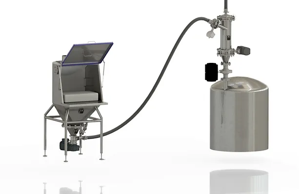 In this case powder will be transferred by using PTS Powder Transfer System® and DosiValve® for accurate dosing, both of which are connected to the DCS® system.